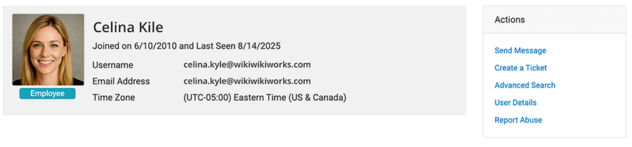 note: To protect privacy, sensitive information such as email addresses, phone numbers, and usernames is only visible to agents. In addition, if the profile belongs to a non-employee, options such as Create a Ticket, Advanced Search, and User Details will not appear in the Actions panel. This layout ensures that all available actions are easy to find while safeguarding user information and tailoring access based on role.