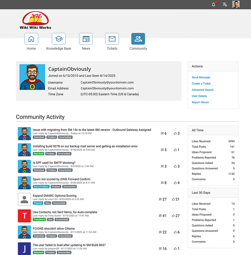 Profiles in the Community Portal provides a detailed view of a member’s activity and participation. At the top of the page, the profile card displays basic information such as the user’s display name, join date, last activity date, username, email address, web address, and time zone. This information is visible to administrators and agents, but may be restricted for standard community members to protect user privacy.